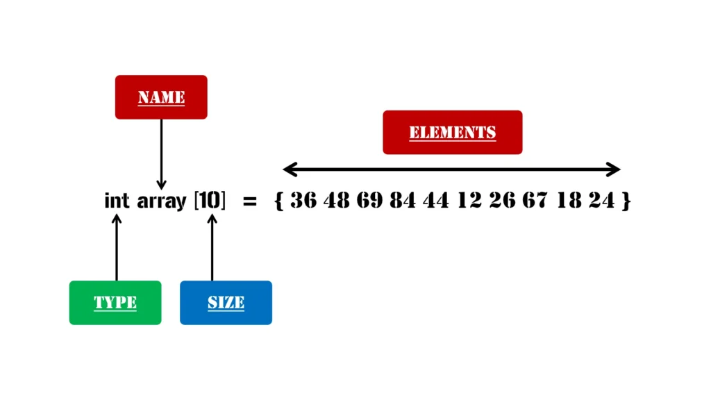 int,float). This property enables efficient memory allocation and access. - Fixed Size: The length of an array is determined at the time of its declaration, meaning we must specify its size upfront.